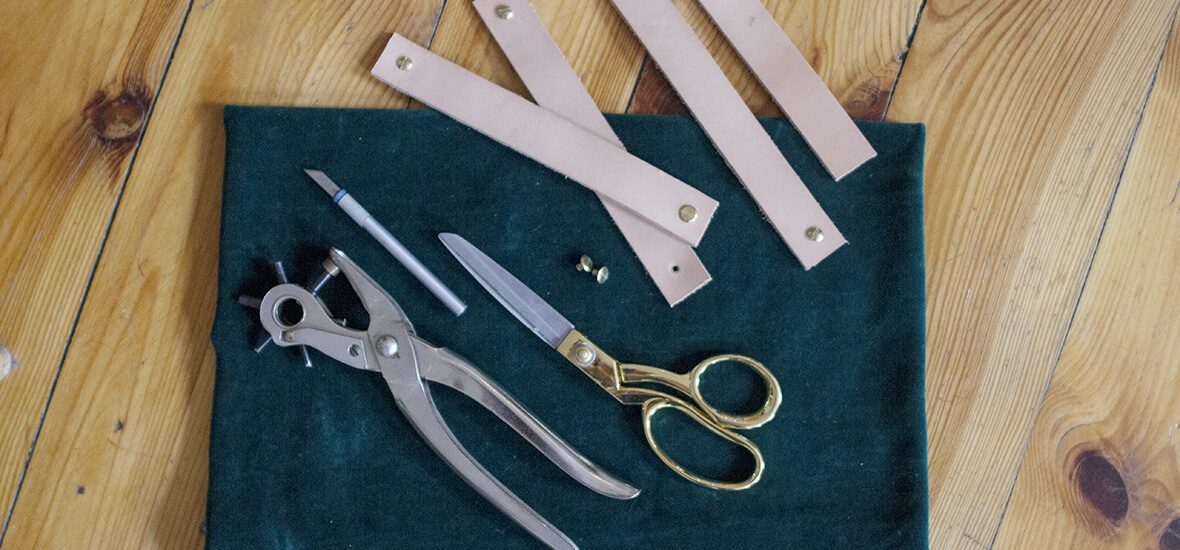 - Wszystko, czego potrzebujemy, to kawałek tkaniny (ja wykorzystałam welur w odcieniu butelkowej zieleni, który pozostał mi po uszyciu poszewek na poduszki), cztery skórzane paski, cztery nity kaletnicze (wykorzystałam miedziane), nożyczki lub ostry nóż oraz wycinak do skóry. Potrzebny będzie również stabilny mebel, do którego przymocujemy nasz hamak :)