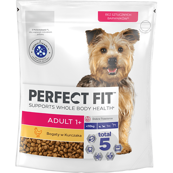Pyszny pokarm Perfect Fit™ Adult 1+ bogaty w kurczaka zawiera wyjątkową formułę Total 5, która wspiera 5 najważniejszych obszarów zdrowia dorosłego pupila: wspomaga silny układ odpornościowy, zdrowie jamy ustnej, zdrowe trawienie, zdrową skórę i sierść oraz utrzymanie optymalnej kondycji i masy ciała. Receptura Perfect Fit™ Adult 1+ została opracowana we współpracy z lekarzami weterynarii oraz specjalistami ds. żywienia z Instytutu Nauki o Zwierzętach WALTHAM™, aby dostarczyć niezbędne składniki odżywcze dorosłym psom. Tak jak inne warianty, również pokarm Perfect Fit™ Adult 1+ bogaty w kurczaka dostarcza dodatkowe korzyści: wspomaga dobre trawienie dzięki optymalnej mieszance włókien pokarmowych oraz zawiera prebiotyki, aby dbać o mikrobiom jelitowy. Wybierając to pożywienie dla swojego pupila małej rasy, masz pewność, że unikalna formuła Perfect Fit™ wspiera zdrowie całego organizmu Twojego psa oraz zapewnia mu dodatkowe korzyści zdrowotne, które są specjalnie dopasowane do jego wieku i indywidulanych wymagań.